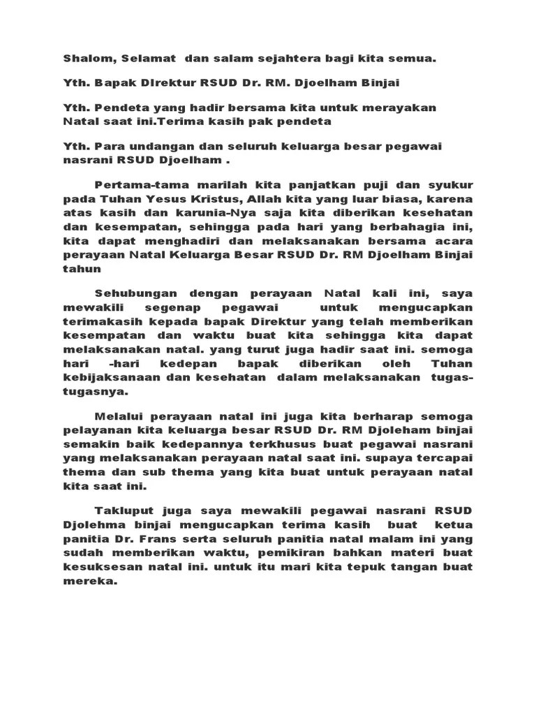 Salam sejahtera dalam kristus yesus puji syukur kita panjatkan kepada tuhan yesus, gembala agung kita yang senatisa menyertai kita setiap saat. Dalam membuat kata sambutan, tidak boleh monoton dan membosankan. Segala puji bagi tuhan yang telah memberikan nikmat dan juga kesehatan sehingga kita dapat berkumpul bersama pada kesempatan kali ini. Sambutan juga biasanya dibawakan saat perayaan natal di gereja. Kebaktian natal umum ii, sabtu 26 desember 2016 jam 10.00 wib.